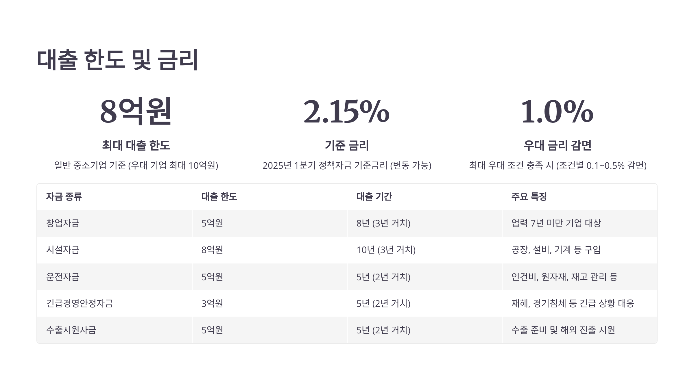 대출 한도는 자금 종류에 따라 다르지만, 기본적인 운영자금은 최대 7천만 원까지 가능하고요. 창업자금은 시설 투자 포함 시 1억 원 이상도 가능하답니다. 특히 창업 초기나 재난피해 대상자는 우대 조건이 적용돼 더 높은 금액을 받을 수 있어요.