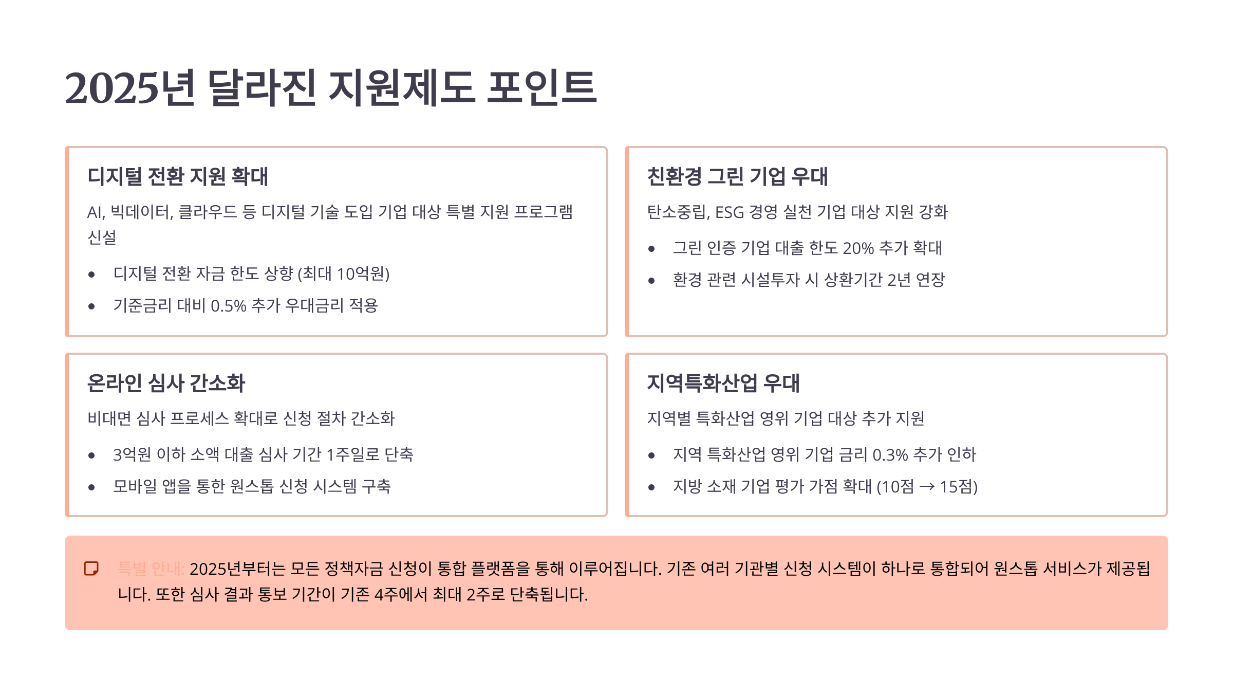 💬 다음 박스는 "2025년 달라진 지원제도 포인트"예요. 새롭게 추가된 자금 항목, 바뀐 심사 기준까지 정리해드릴게요!