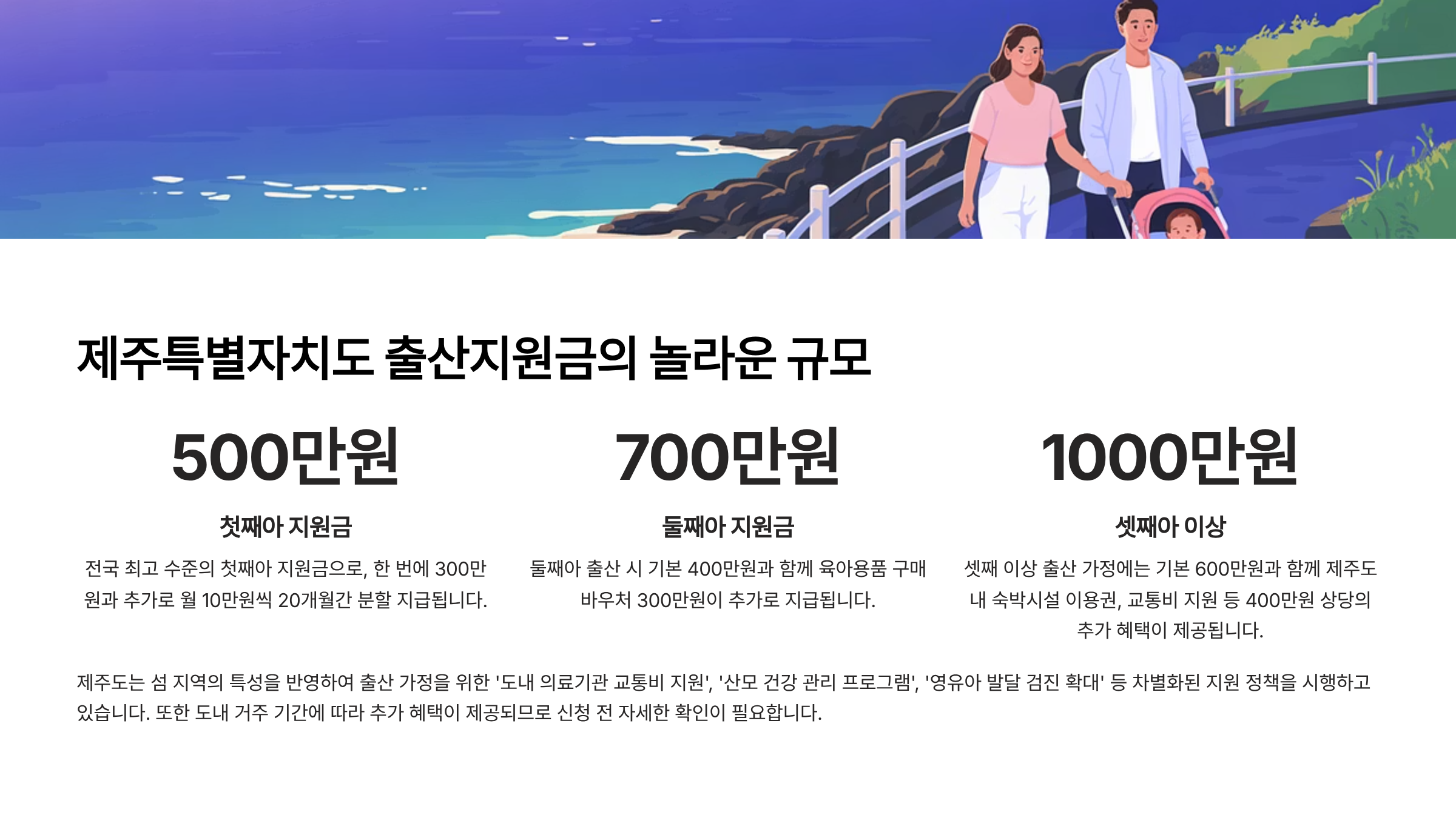 제주는 도 단위 프로그램과 시·군(제주시·서귀포시) 보완책이 결합돼요. 특징은 자연환경 기반 돌봄·보건 프로그램 연계가 많고, 지역 내 산후케어 체계와도 파트너십을 구성하는 사례가 보인다는 점이에요. 거주 요건과 출생아 거주 등록 요건을 함께 확인해요.