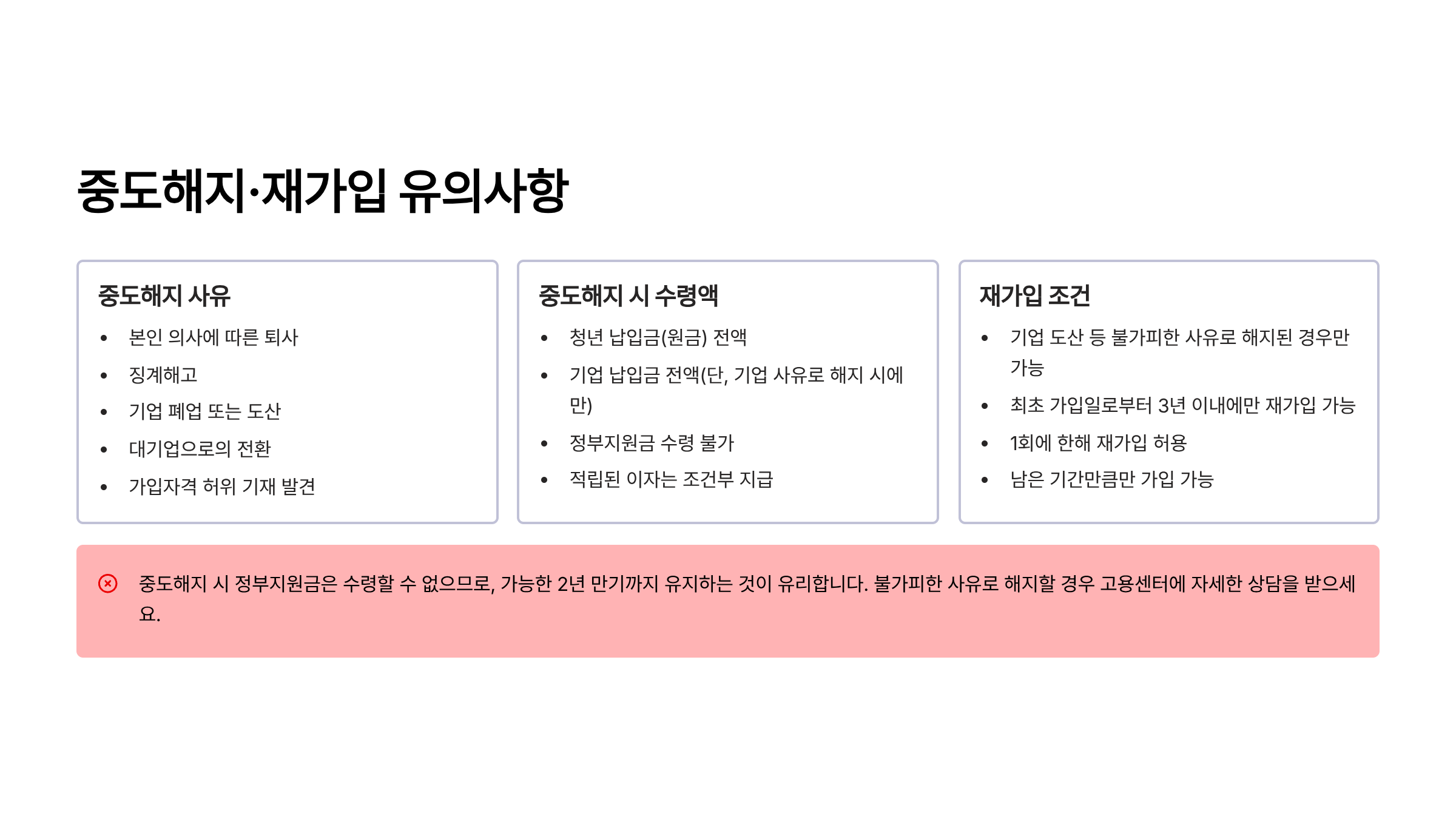 해당 금액은 근속 기간 동안 중도 이탈 없이 유지했을 때만 받을 수 있어요. 해지 시 지원금 일부 또는 전부를 받을 수 없기 때문에 ‘완주’가 정말 중요해요.